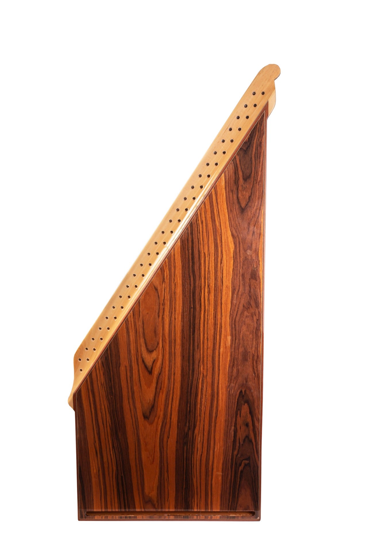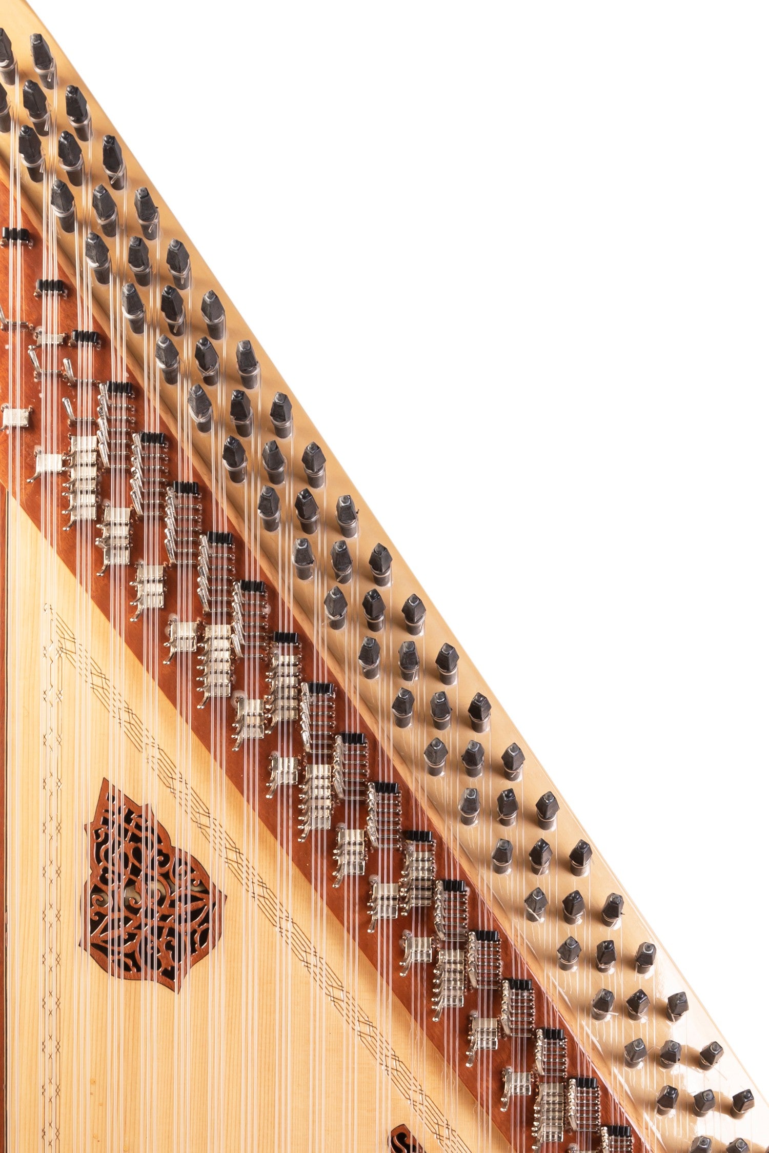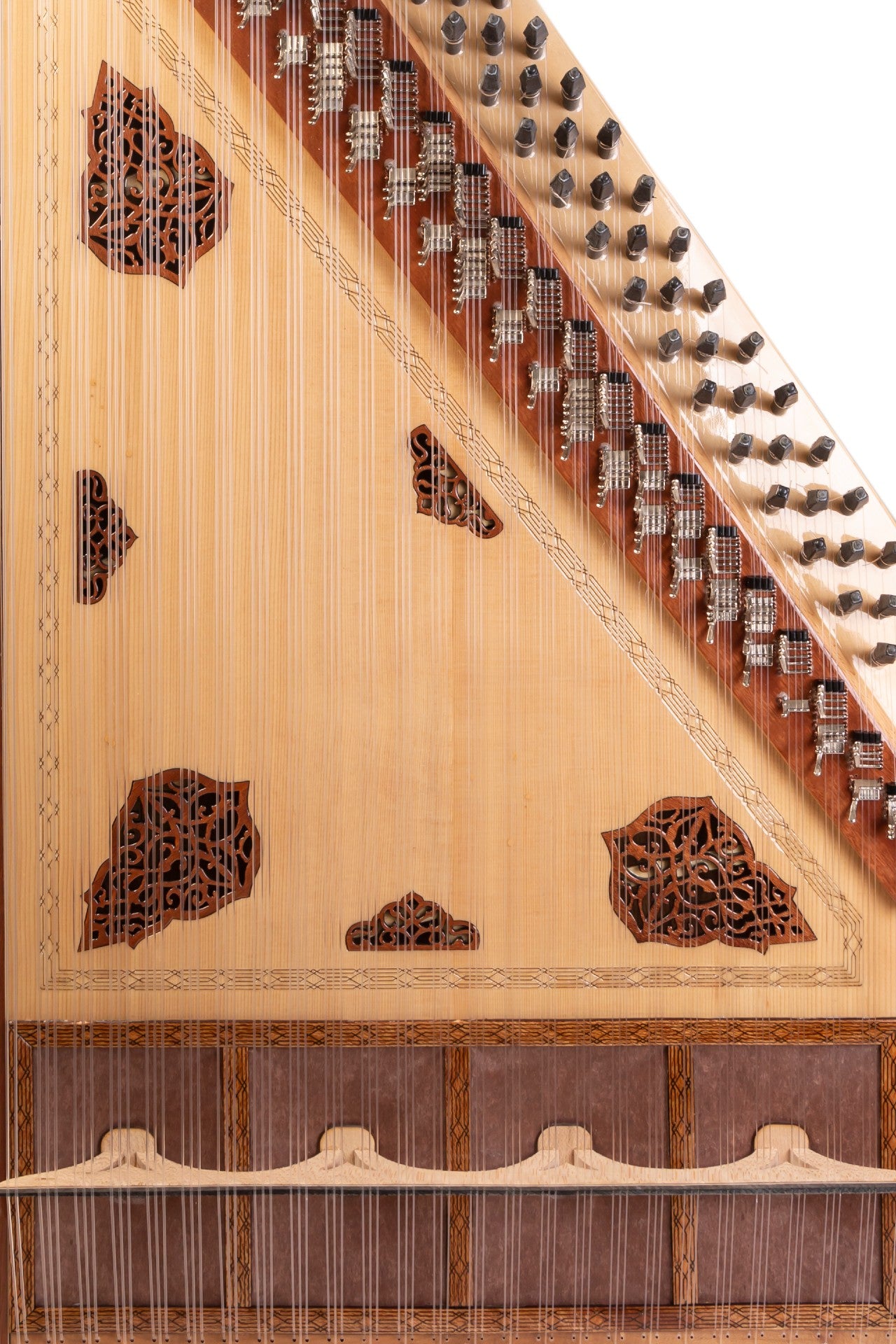 قطعة خشب التنوب الضخمة، مُدمجة مع أوتاد من خشب الأبنوس وأوتار من مادة البولي فينيل كلوريد (PVF) لتوفير جودة صوت فائقة. كما أن استخدام الجلد الصناعي والدبابيس الفضية واللمسات النهائية يُضفي على آلات القانون التركية الرائعة جمالاً أخّاذاً ودائماً.